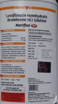 - Targeted Action: Formulated with Levofloxacin Hemihydrate and Bromhexine HCL, MERIFLOX BH effectively tackles the root cause of severe respiratory infections, ensuring rapid recovery and minimal discomfort for your poultry.