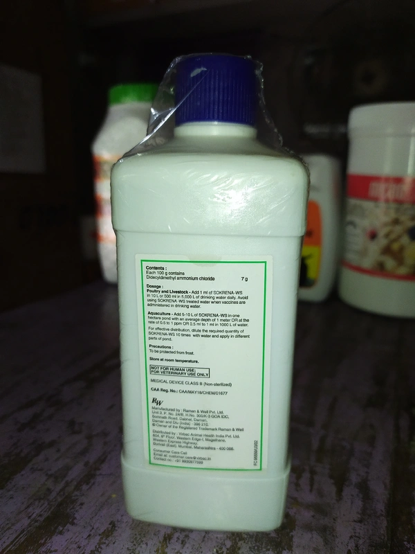 - Poultry & Livestock : Add 1 ml of Sokrena-ws in 10 L or 500 ml of drinking water daily. Avoid using Sokrena-ws treated water when vaccine are administered in drinking water.